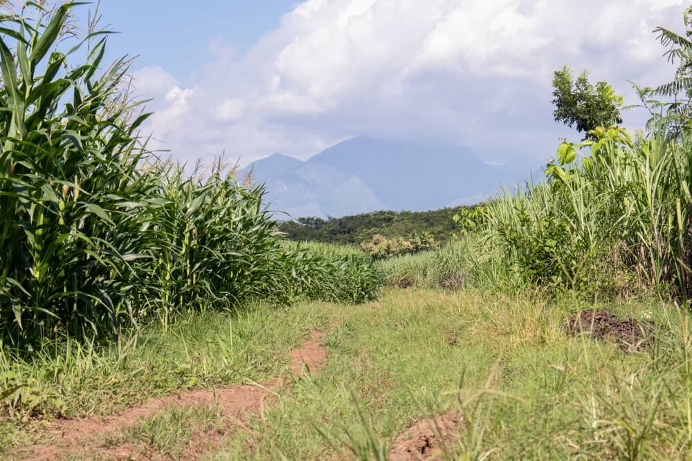 山を背景にしたトウモロコシ畑や草原の風景